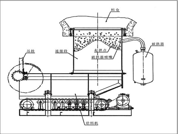 防止在給料機(jī)距離倉口較高的時(shí)候,連接段內(nèi)的物料壓實(shí)粘結(jié)成拱或粘壁