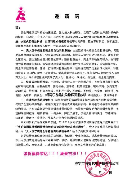 我公司應煤炭科技的快速發(fā)展,強力投入科技研發(fā),實現了為煤礦生產提供領先的機械化、自動化、專業(yè)化產品,現我公司研制成功的無人值守旋連膠鏈全息自動裝載系統(tǒng)、快裝式膠鏈給料機、自清料輪式鏈板給料機等專利產品,已在棗礦集團、臨礦集團、鄭煤集團等礦業(yè)集團投入使用,并得到高度認可和好評。